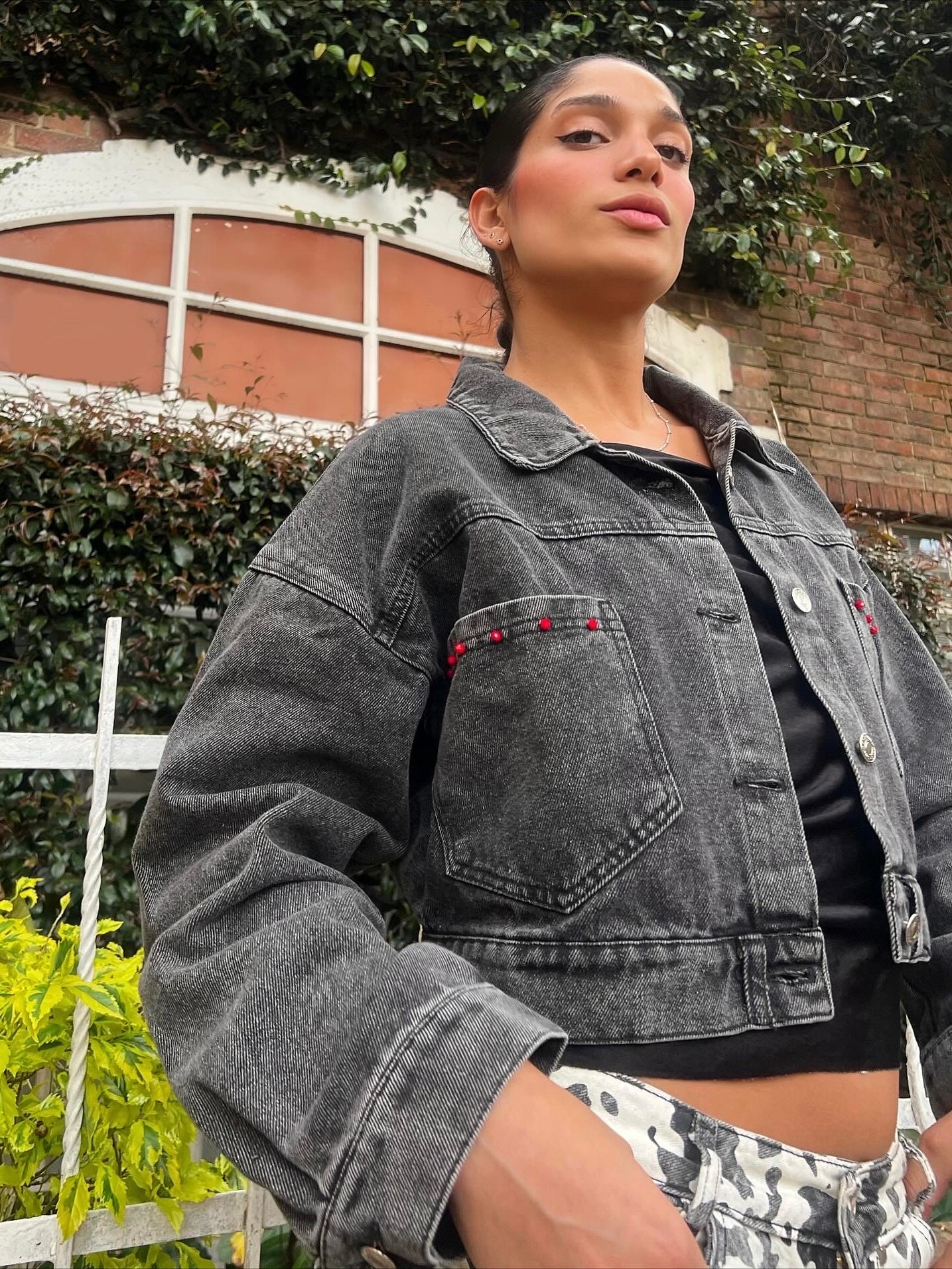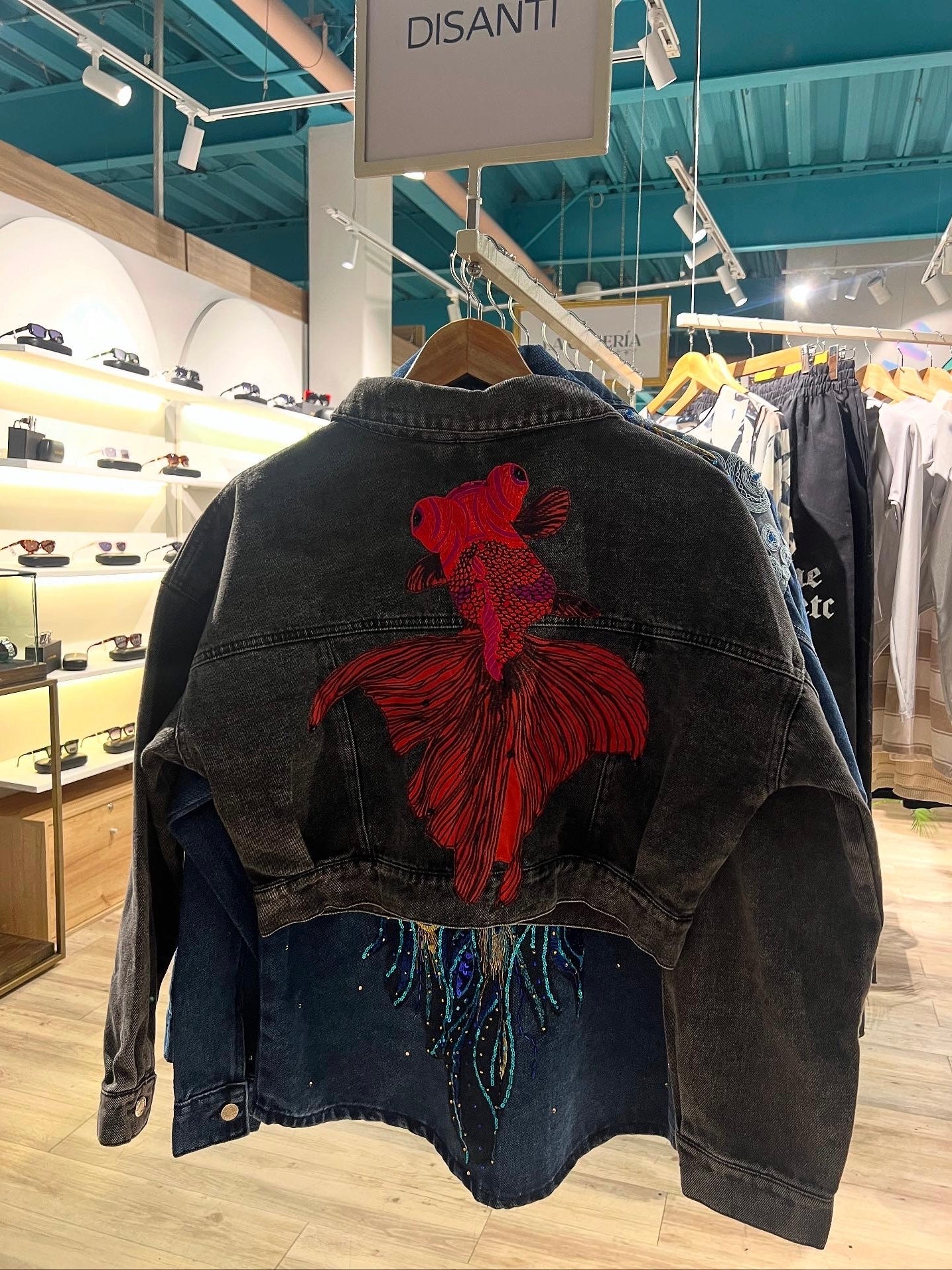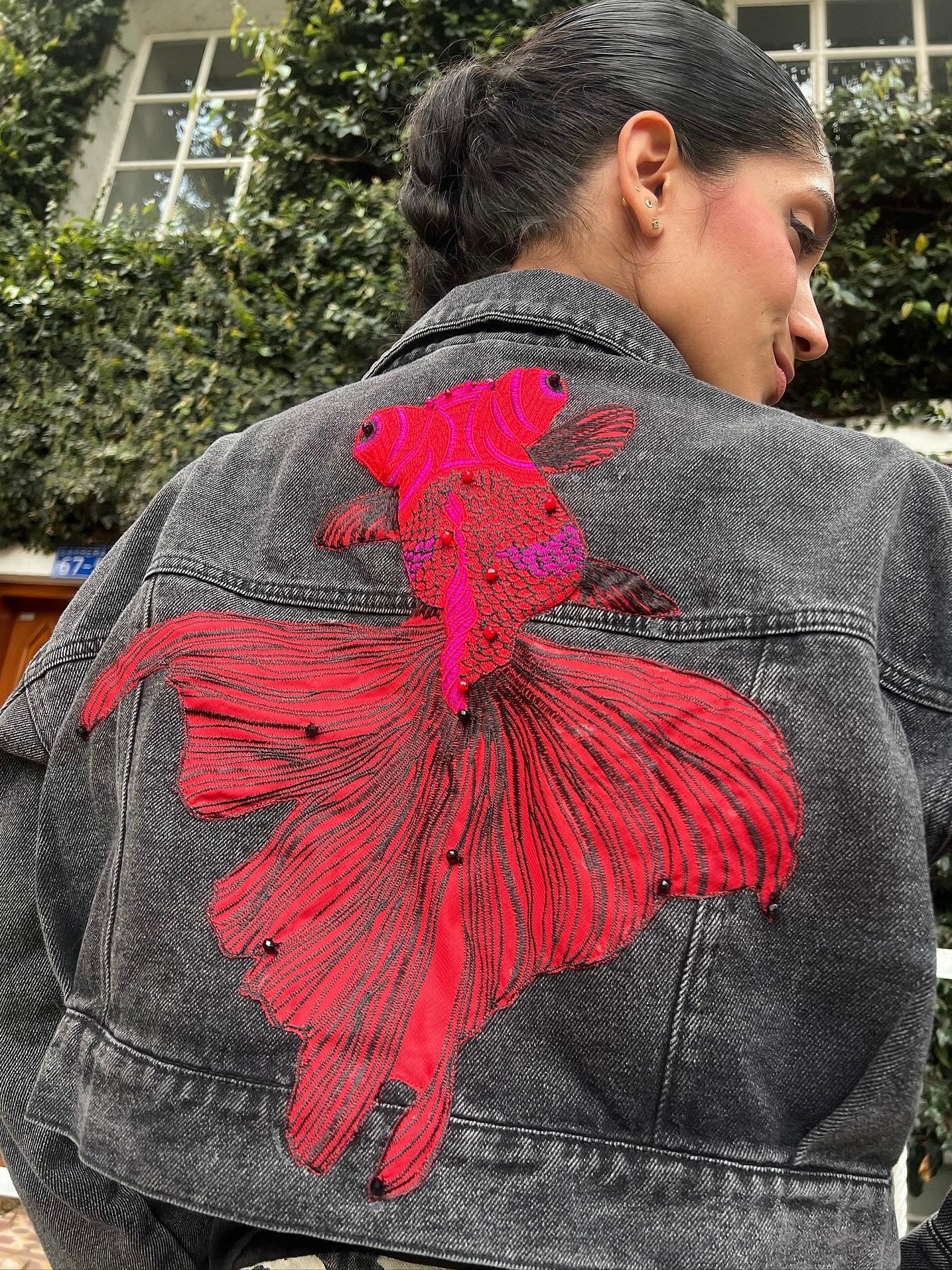 Brilla con Betta. Un pez betta rojo recamado en murano cobra vida sobre el denim, fluyendo con fuerza, pasión y movimiento. Una pieza divina que transforma tu look en una obra de arte.