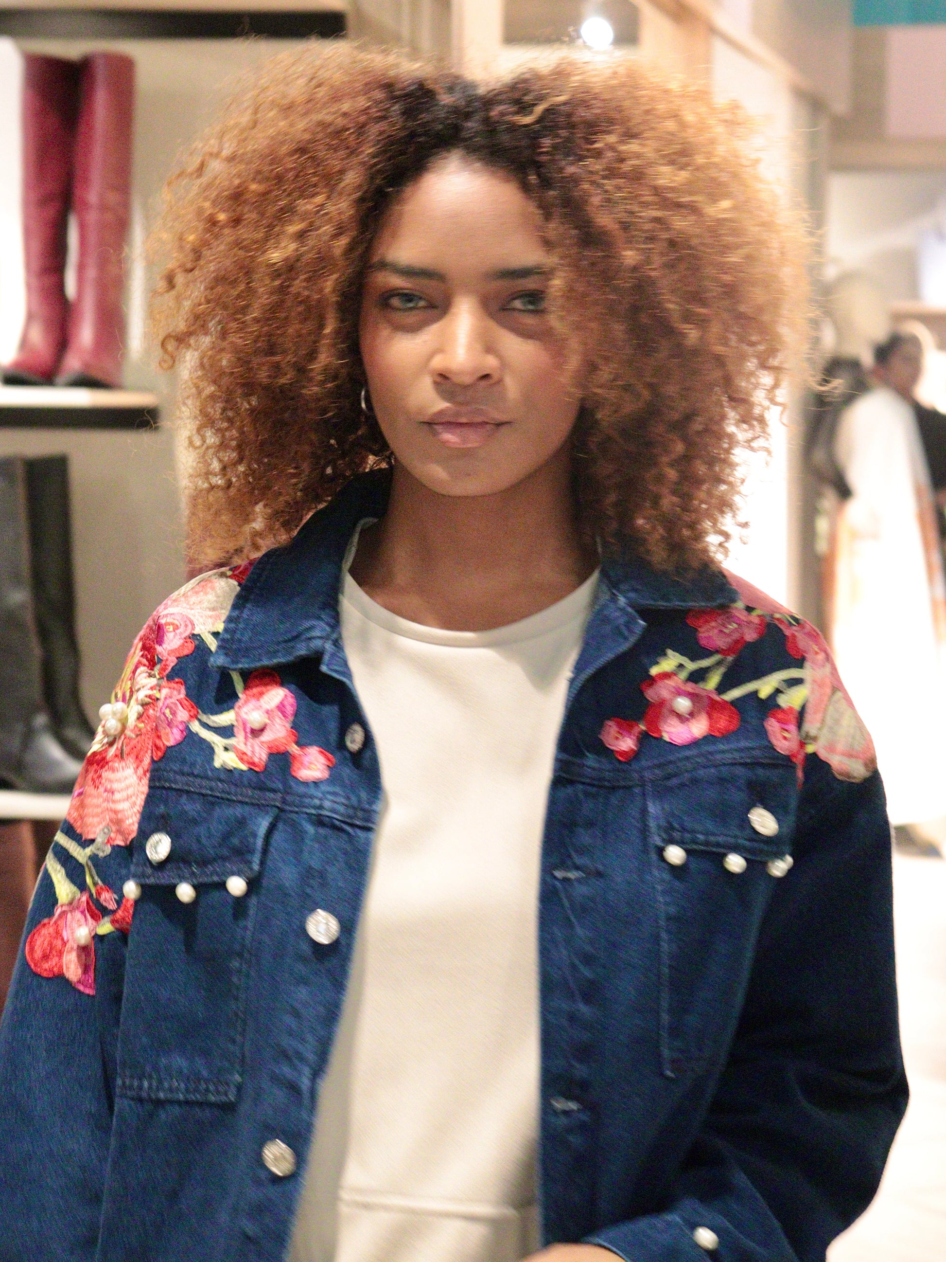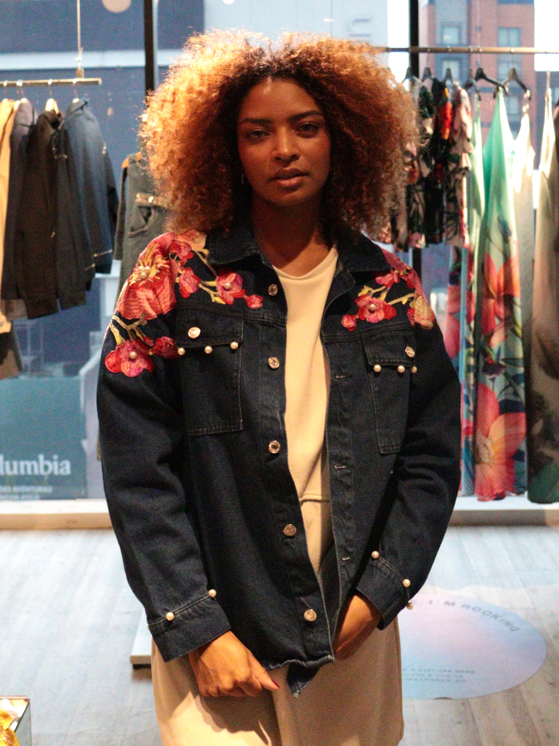Brilla con Magnolia. Magnolias bordadas y perlas delicadas se posan sobre el denim, creando una pieza etérea que equilibra fuerza y suavidad. Una chaqueta que florece con luz propia.