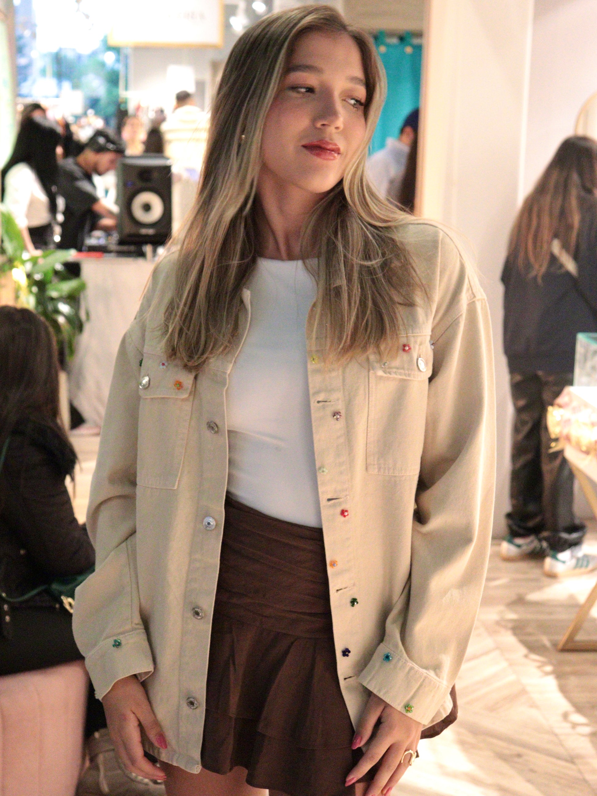 Flores en murano sobre denim beige, creando una pieza que nace de lo natural y se vuelve extraordinaria.